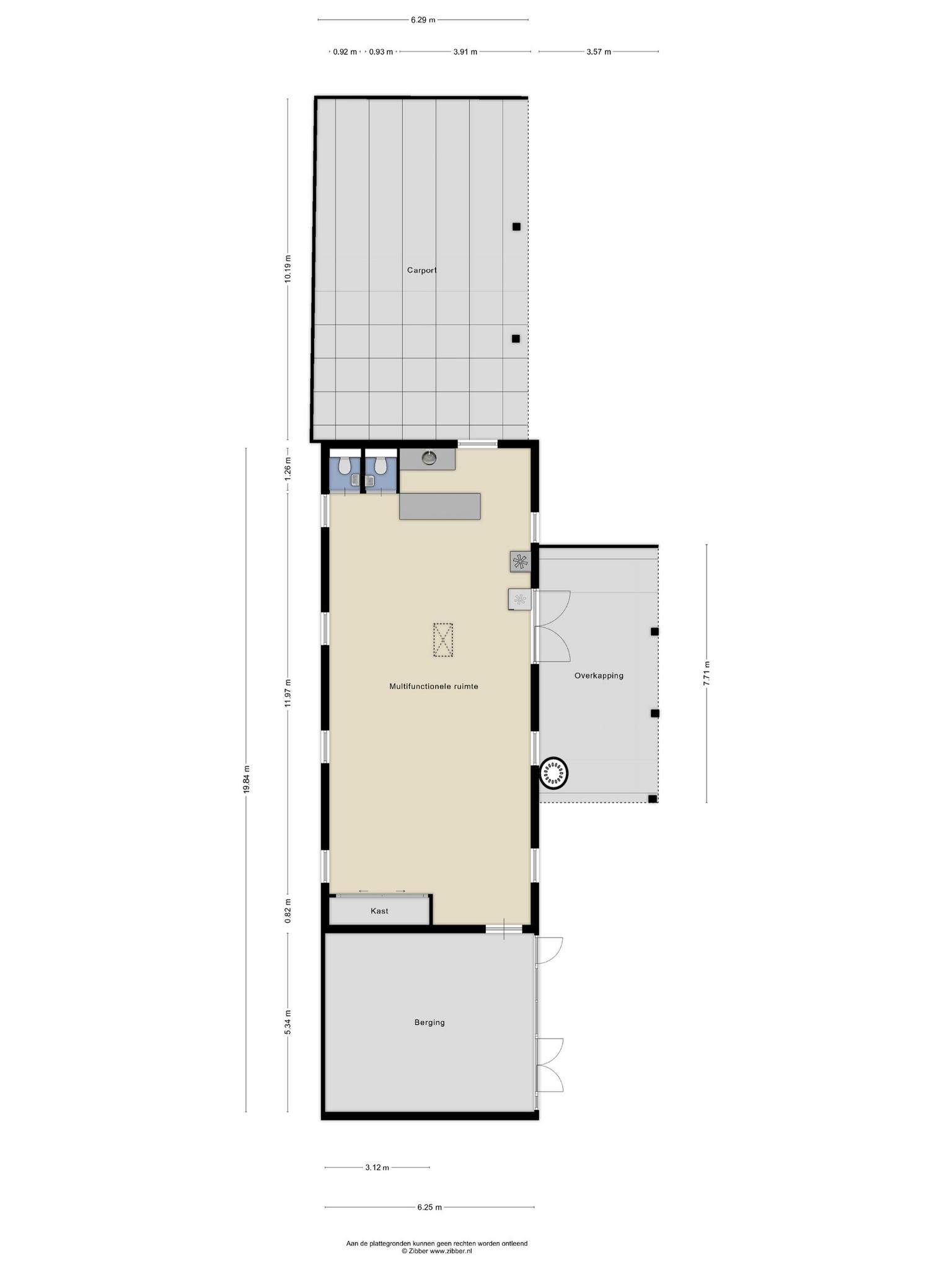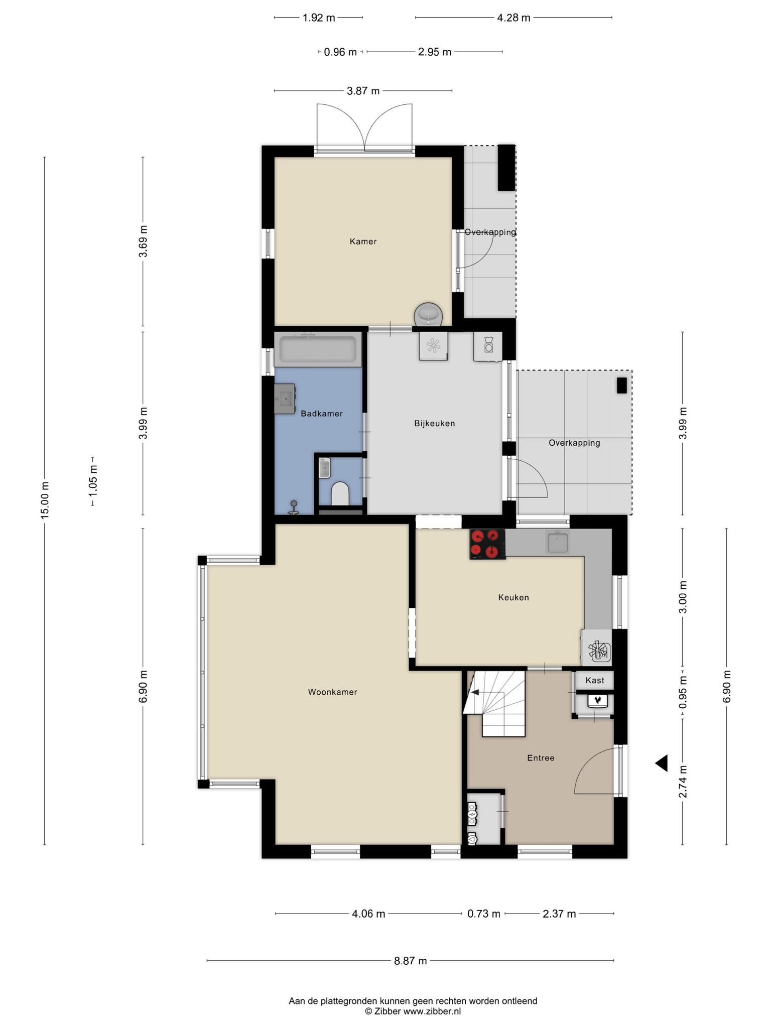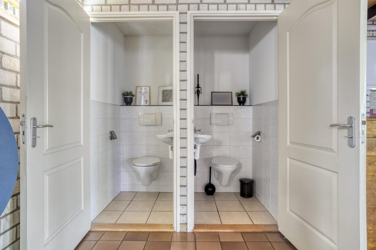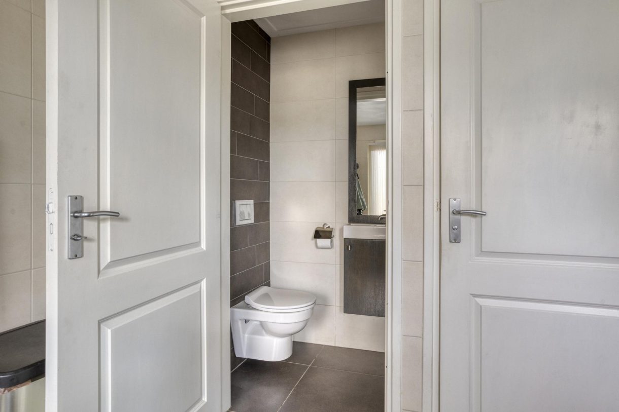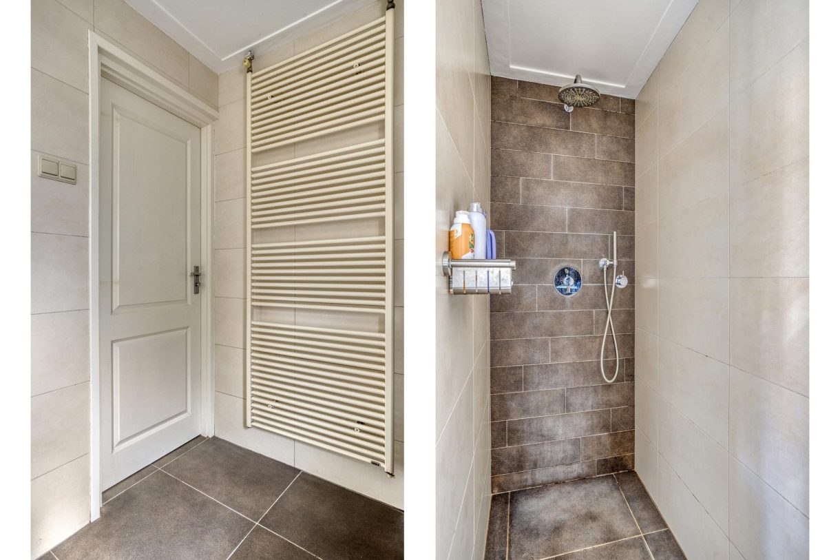 In de achterbouw van de woning is een grote bijkeuken met witgoedaansluitingen en een buitendeur. Vanuit deze bijkeuken is ook de toiletruimte, badkamer en slaapkamer op de begane grond toegankelijk. Deze slaapkamer op de begane grond is ruim 14 m² groot en heeft openslaande deuren naar de tuin en naar de overkapping aan de zijkant. Naast slaapkamer kan deze kamer ook prima dienst doen als kantoor/praktijkruimte aan huis dan wel een tuin-/speel- of werkkamer. De keurige badkamer is voorzien van een ligbad, inloopdouche en wastafel met meubel.