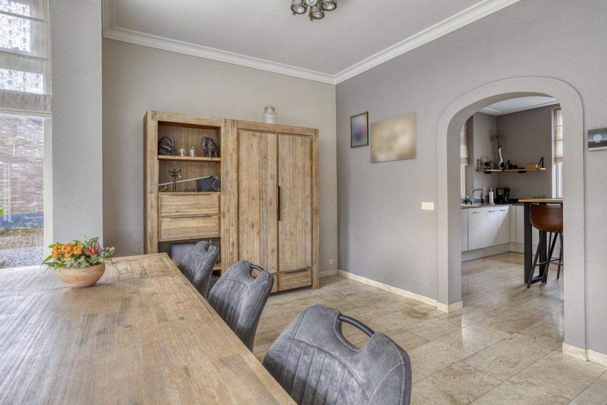 Indeling: Ruime hal met (vernieuwde) meterkast en cv.-kast (Nefit HR combiketel uit 2019). In de hal is ook de trap naar de verdieping. Vanuit de hal is toegang tot de woonkeuken met moderne inrichting voorzien van inductiekookplaat met geïntegreerde afzuiging, vaatwasser, koelkast, combi oven/magnetron en een kokend water kraan. Op de vloer in de keuken ligt een travertin vloer met vloerverwarming, welke doorloopt in de woonkamer. De woonkamer heeft een grote erker aan de zijkant van de woning en daardoor is dit een fijne lichte woonkamer.