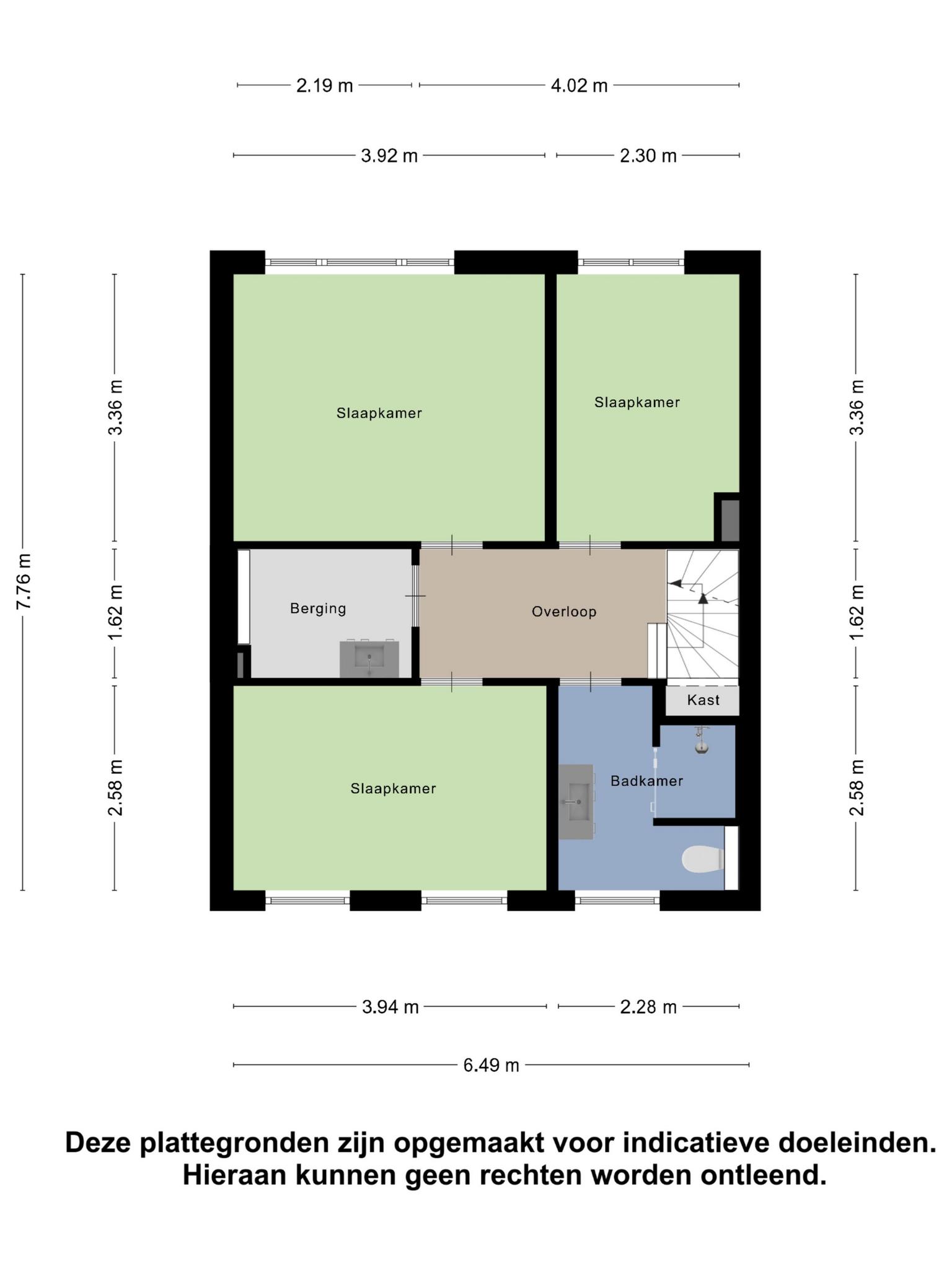Via de overloop met airco zijn de drie slaapkamers, de badkamer en wasruimte te bereiken. De slaapkamers zijn respectievelijk 8-10-13 m2 groot en allen voorzien van laminaatvloeren. De badkamer uit 2020 is modern en beschikt over vloerverwarming en is voorzien van een douche, wandcloset en wastafelmeubel met dubbele kraan. Tot slot is er een praktische wasruimte (voorheen badkamer) met witgoedaansluitingen.