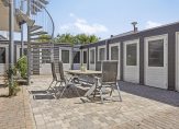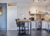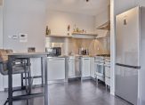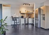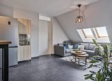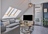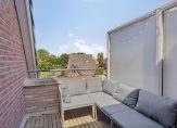 De woonkamer met open keuken is ruim van opzet. Er is voldoende ruimte voor een eettafel en zithoek. Op de vloer liggen tegels met vloerverwarming. Er is ligt vanuit de glaspuien rondom het balkon en vanuit een tweetal dakramen. De open keuken heeft een moderne inrichting met een 4 pits gasfornuis met oven. Verder is er beschikking over een vaatwasser. Het balkon is 6 m² groot en voorzien van een houten vlonder. Op het terras is een beschutte plek om te zitten en te genieten van het uitzicht richting de kruising.