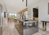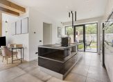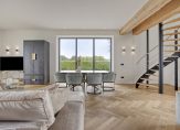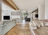 Via de entree van de woning komt u in een ruime hal met toegang tot de technische ruimte. Hier staan de pellet cv.-installatie en het buffervat. Verder is hier ook de meterkast van de woning. Vanuit de hal is een open doorgang naar de woonkamer. Dit is een werkelijk fantastische grote ruimte met veel lichtinval en prachtige pui gericht op de tuin. Aan de achterzijde zijn openslaande tuindeuren naar een groot terras. In de woonkamer is een prachtige vide naar de verdieping welke via een zeer fraaie trappartij te bereiken is. Deze open stalen trap met hardhouten treden is een echte blikvanger in de leefruimte. Ook de open keuken heeft een prominente plek in deze leefruimte en dat is volledig terecht. Deze fantastische keuken is een walhalla voor de echte kookliefhebber. Er is een groot kookeiland met inductiekookplaat en geïntegreerde afzuiging. Verder zijn inbouwapparaten zoals een vaatwasser, koelkast met 0-gradenvak, vriezer, combi oven/magnetron en combi stoomoven aanwezig. Bij de keuken is ook een glaspui met loopdeur aanwezig naar het terras aan de rechterzijde van de woning. Vanuit de keuken is ook een doorloop naar de berging bijkeuken met buitendeur naar de tuin. In deze bijkeuken is een mooi maatwerkmeubel geplaatst met wastafel. Verder is er nog een luxe toiletruimte.