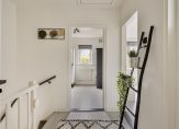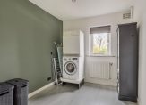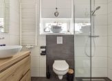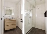 Op de 1e verdieping is een overloop met toegang tot 3 slaapkamers en de badkamer. Deze badkamer is keurig afgewerkt met een mooie inloopdouche, wandcloset, wastafelmeubel met waskom. Er is een designradiator aanwezig voor verwarming en er is mechanische afzuiging in de badkamer. Alle slaapkamers hebben laminaatvloeren en nette wand-/plafondafwerkingen. Met een vlizotrap is toegang tot de bergzolder. Hier hangt de Nefit HR combiketel uit 2023 en is een zolderkamer met klein dakraam.