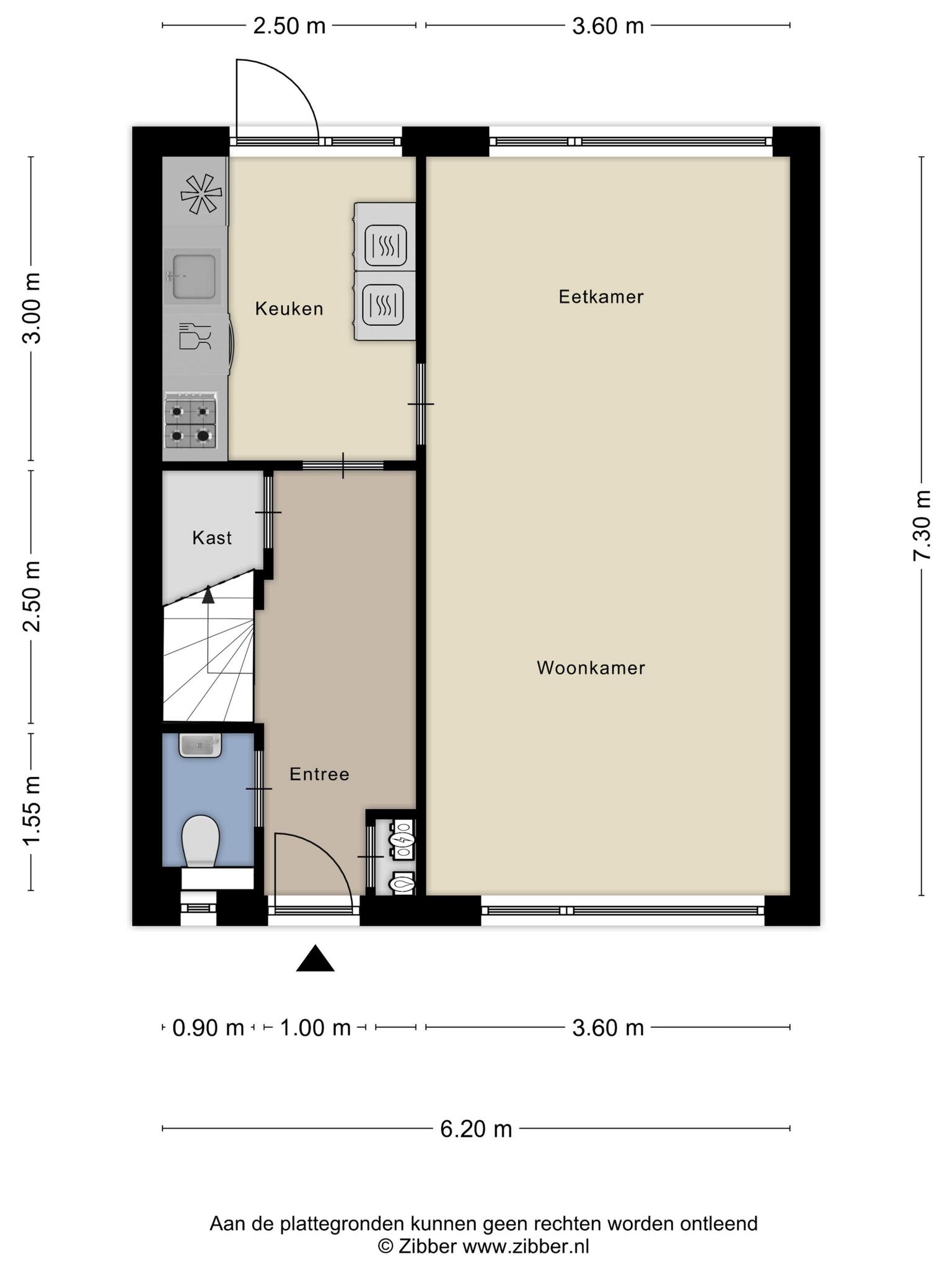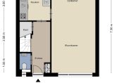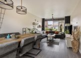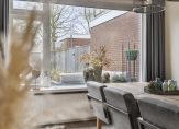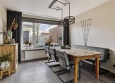 Hal met meterkast, trap-/provisiekast en keurige toiletruimte voorzien van wandcloset en fontein. Dichte keuken met nette inrichting voorzien van inbouwapparatuur zoals combi oven/magnetron, vaatwasser, gaskookplaat en vaatwasser. In de keuken is ook een buitendeur naar de tuin. Op de vloer ligt laminaat in de keuken en dat geldt ook voor de woonkamer. Deze woonkamer is 26 m² groot een keurig afgewerkt.