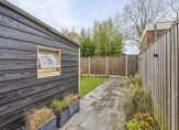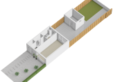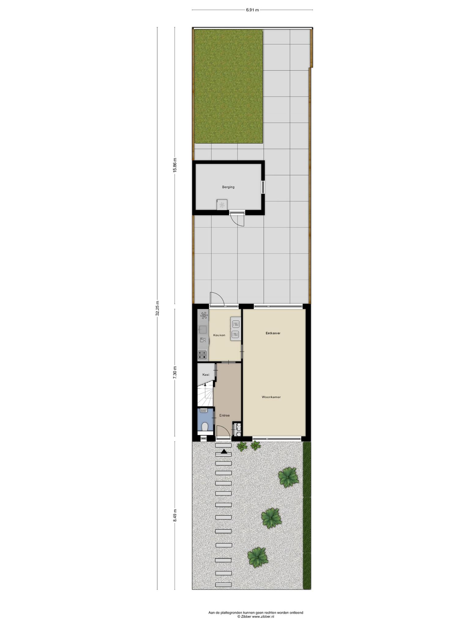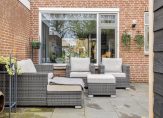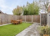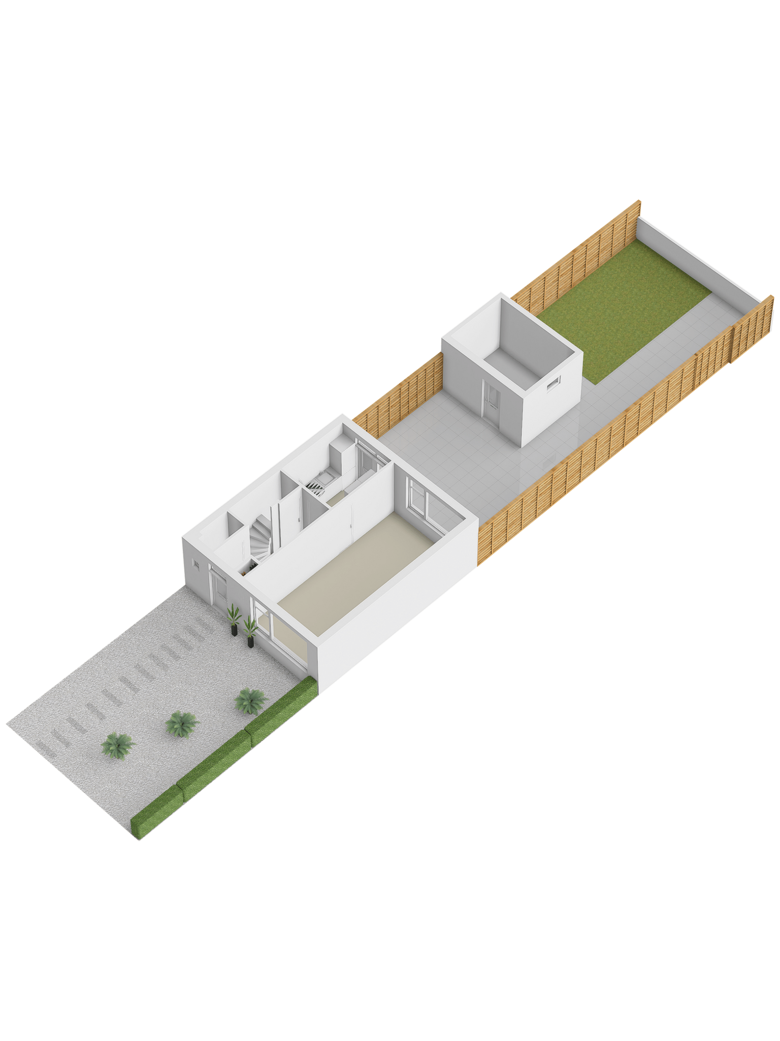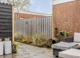 De tuin is verzorgd aangelegd met grote terrastegels en kunstgras. Er staan nette schuttingen rondom en de tuin is achterom bereikbaar. In de tuin staat een stenen tuinberging voor opslag en stalling van de fietsen. Ook de voortuin is keurig aangelegd. Aan de straatzijde is ruimte om de auto te parkeren.