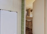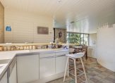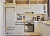 De halfopen keuken ligt verhoogd ten opzichte van de woonkamer en heeft een ingebouwde inductiekookplaat, oven en koelkast. Náást de bar is ruimte voor een eettafel. In de aangrenzende bijkeuken bevinden zich de cv.-ruimte (met Brink heteluchtverwarmingsketel), een voorraadkast en een achterdeur naar de tuin en schuur.