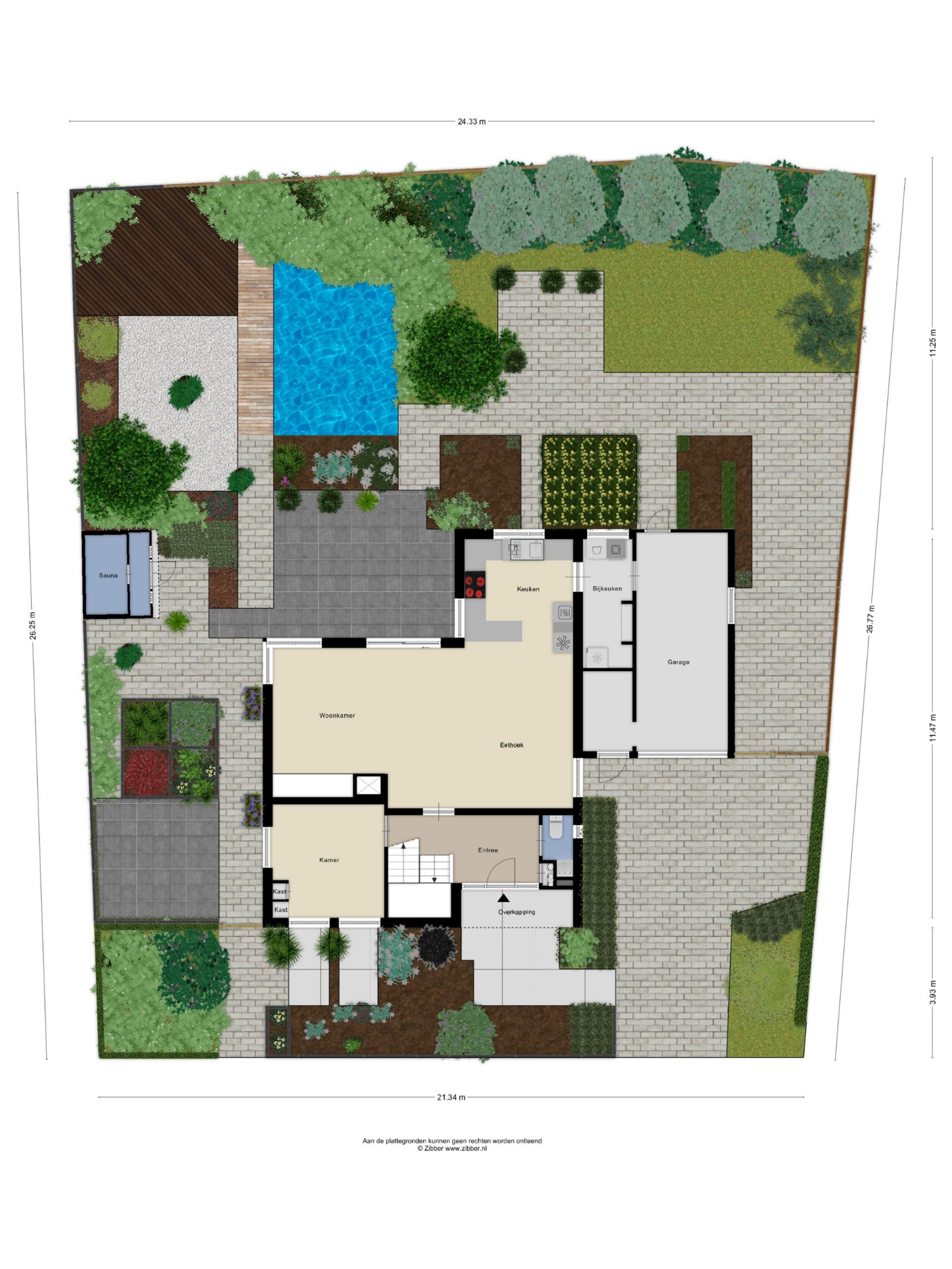De woning staat op een riant perceel van 618 m² met een ruime tuin rondom. De achtertuin is zonnig door de ligging op het zuiden. Verder biedt de tuin veel privacy. Hier geniet je dus volop van rust en ruimte. Aan het huis is een terras met zonneluifel. In de tuin is een beregeningspomp aanwezig, ligt een vijver en is volop groen. Er staat in de tuin een houten tuinhuis, waarin een sauna is gebouwd. Aan de voorzijde is parkeergelegenheid op eigen terrein en toegang tot de garage.