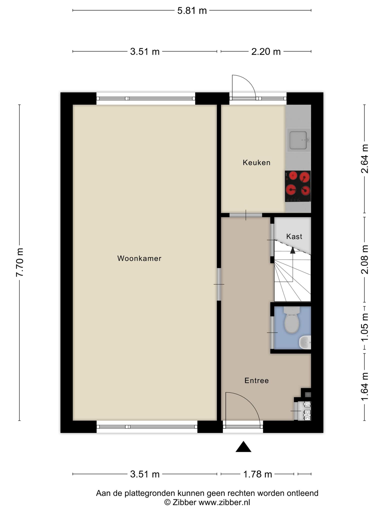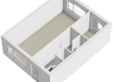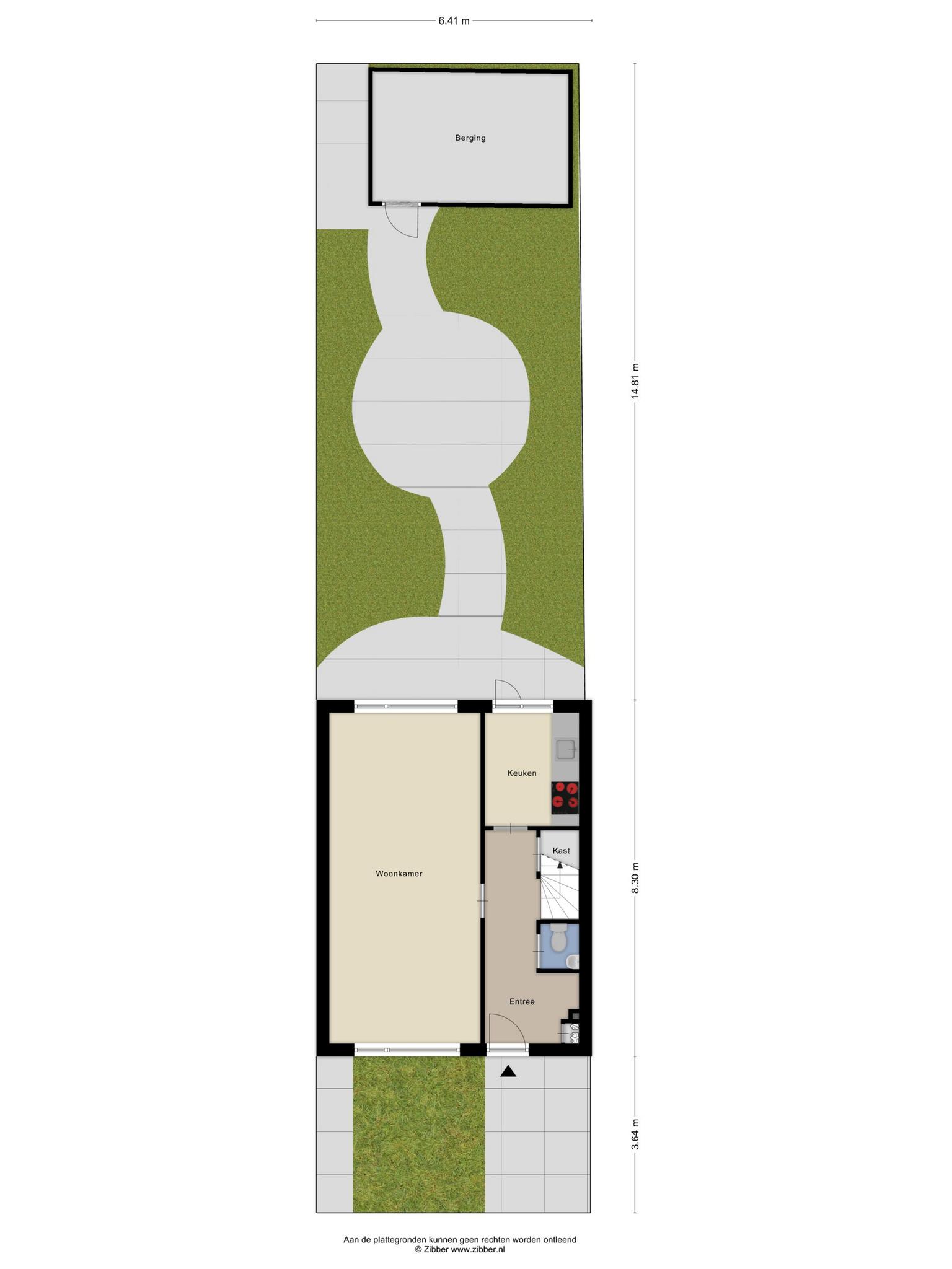 Hal met meterkast, toiletruimte, trapopgang naar de verdieping en provisiekast. De hal biedt toegang tot de woonkamer en de keuken. De woonkamer beschikt over veel lichtinval door de grote raampartijen. Vanuit de hal is er toegang tot de dichte keuken met een eenvoudig recht keukenblok voorzien van gaskookplaat en afzuigkap. Vanuit de keuken is er toegang tot de tuin.