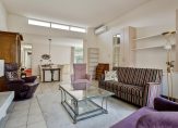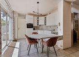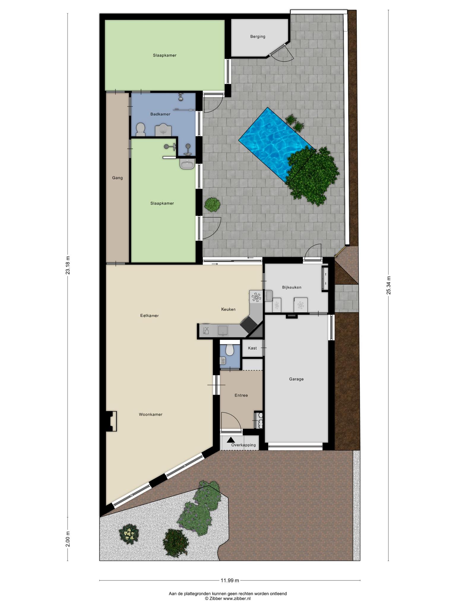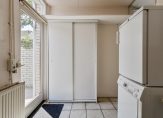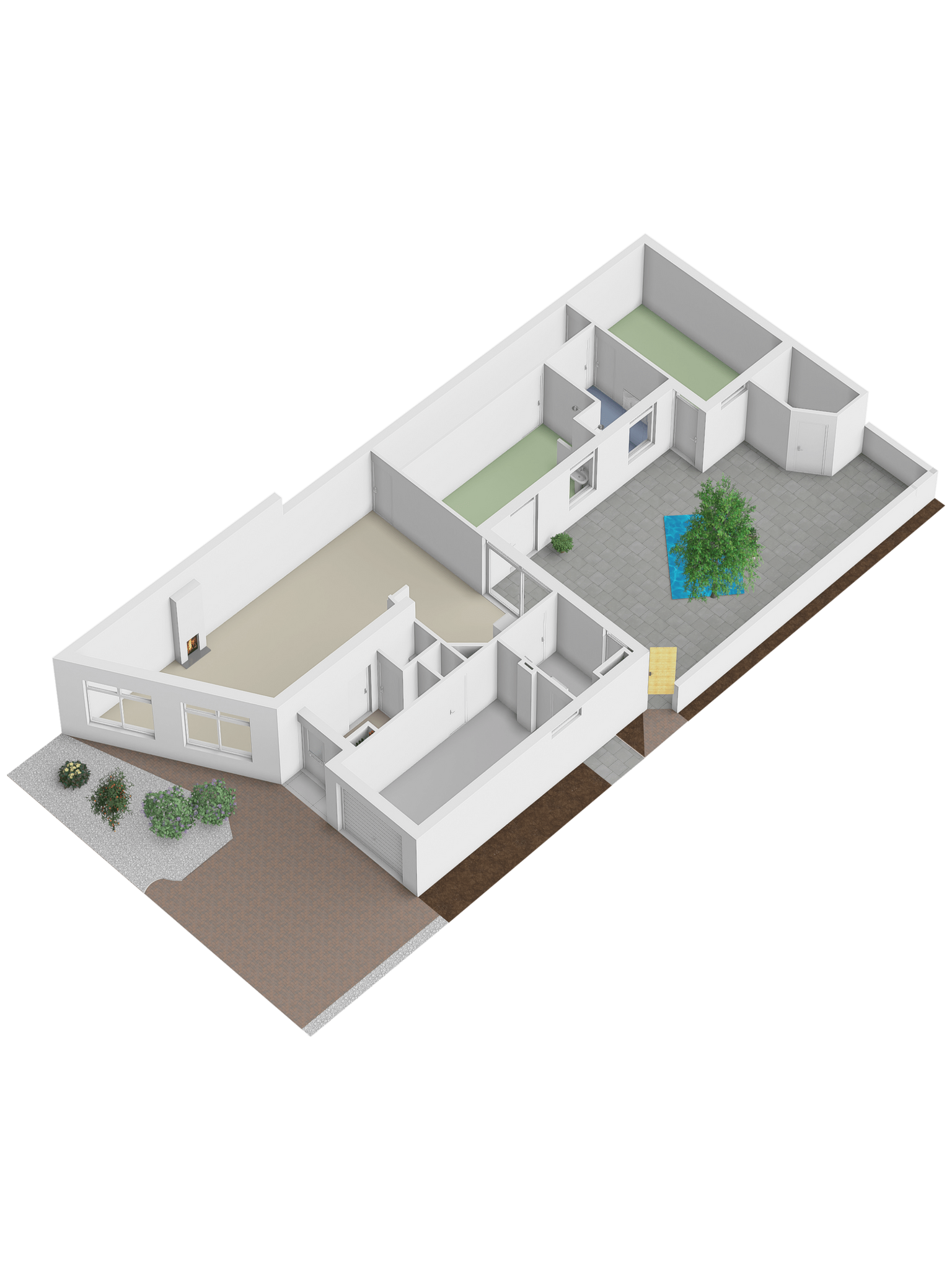Via de oprit zijn de entree en de garage bereikbaar. De hal met tegelvloer is voorzien van de meterkast, garderobe, toiletruimte met wandcloset en fontein en geeft toegang tot de woonkamer. De ruime woonkamer met tegelvloer is onderverdeeld in een zitgedeelte met gashaard aan de voorzijde en een eetgedeelte en open keuken gelegen aan de achterzijde. De woonkamer geeft een ruimtelijk gevoel door de hoge plafonds en veel lichtinval door de grote raampartijen. De woonkamer heeft de beschikking over een airco en geeft middels een schuifpui toegang tot de tuin. De keuken in hoekopstelling beschikt over een inductie kookplaat, afzuigkap, combi oven/magnetron (2023), koelkast en vaatwasser en beschikt verder over voldoende bergmogelijkheden. Vanuit de keuken is er toegang tot de praktische bijkeuken met tegelvloer voorzien gootsteen, witgoedaansluitingen, opstelling cv-ketel en is er toegang tot de tuin. Aansluitend aan de bijkeuken komt u in de inpandige garage met tegelvloer en een elektrische deur welke toegang geeft tot de oprit aan de voorzijde van de woning.