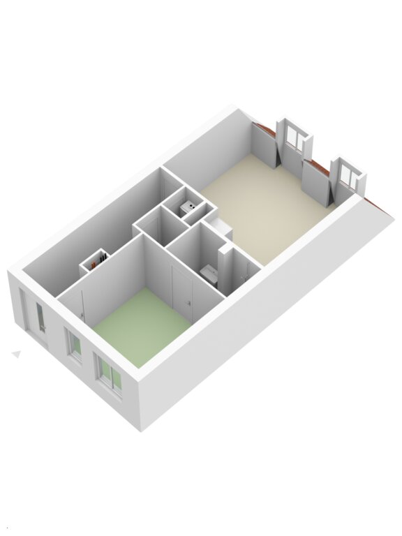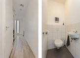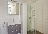 Vanuit de hal is de slaapkamer bereikbaar. De slaapkamer is voorzien van een pvc vloeren geeft direct toegang tot de inpandige badkamer. De badkamer is voorzien van inloopdouche, wastafelmeubel en wandkast. Vanuit de hal is er toegang tot de separate toiletruimte met wandcloset en fontein en berging voorzien van opstelling cv.-ketel (Intergas, 2015), mechanische ventilatie unit en witgoedaansluitingen.