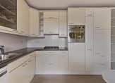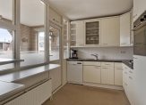 De keuken staat in halfopen verbinding met de woonkamer en is voorzien van nette en complete keukeninrichting met gaskookplaat, oven, koelkast, vrieskast, vaatwasser en apothekerskast. Ook vanuit de keuken kunt u direct naar het balkon.