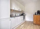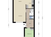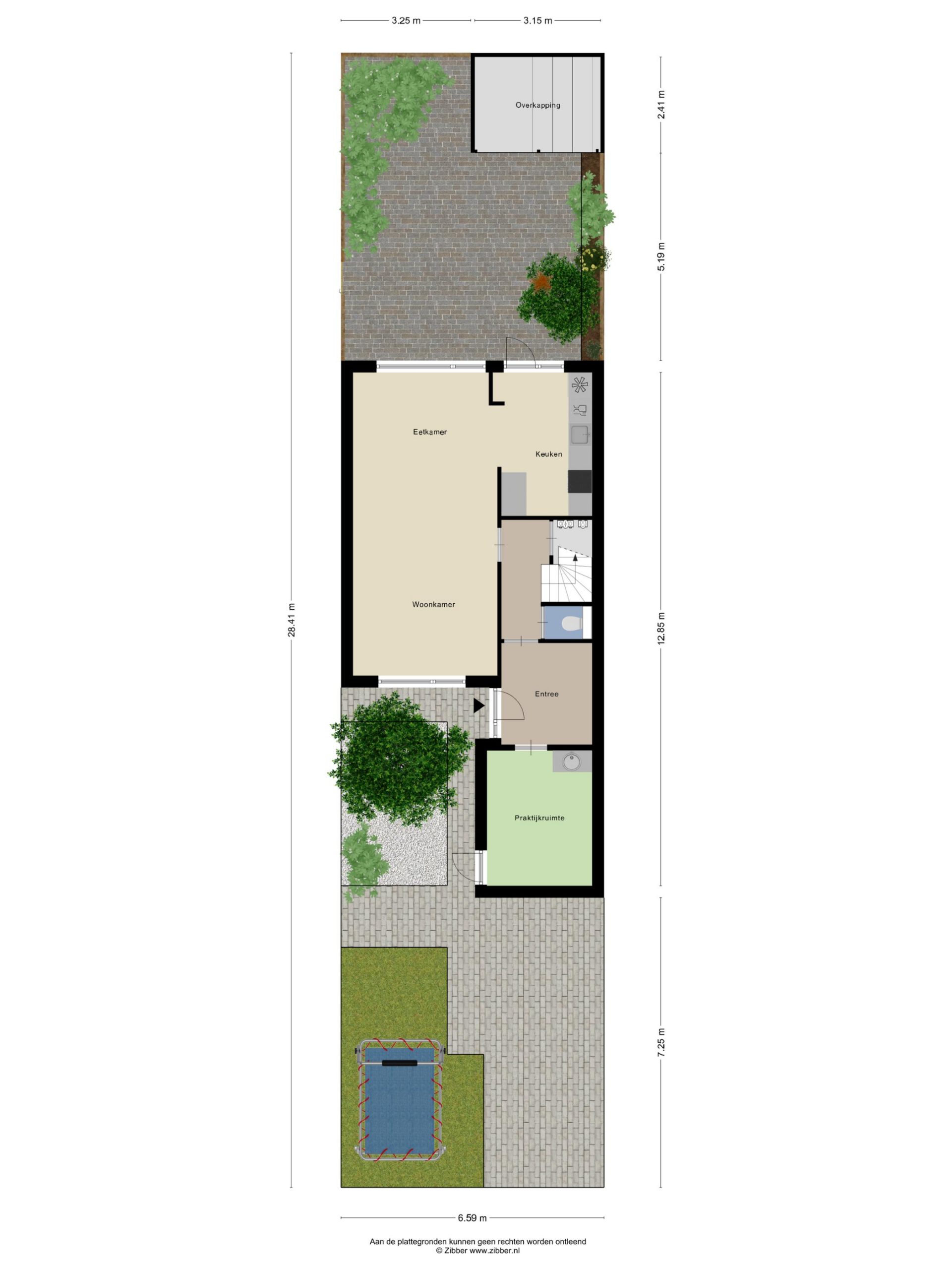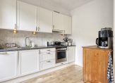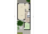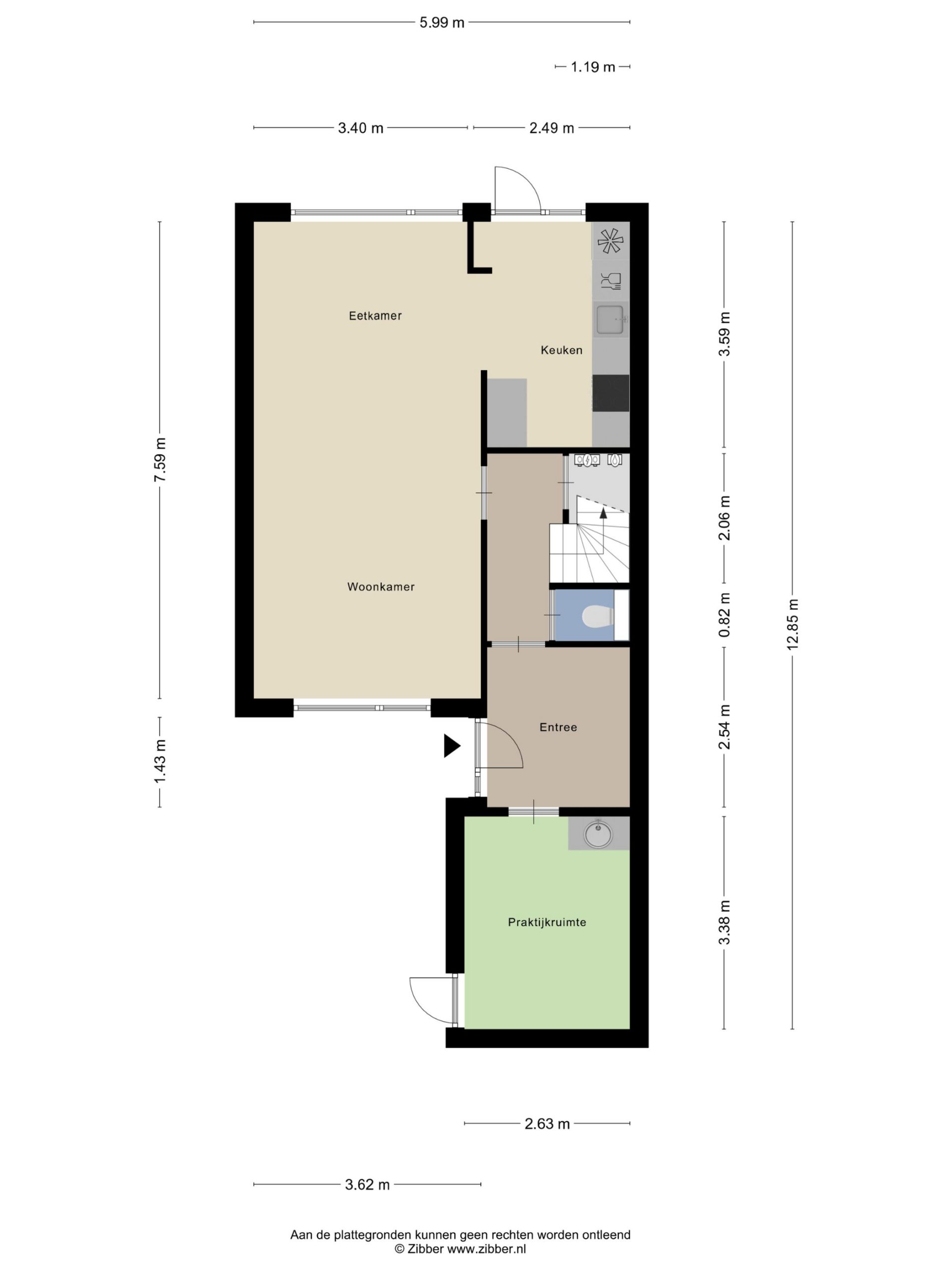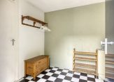 De entree van de woning is via deze voortuin te bereiken. In de ruime entree ligt een tegelvloer en is de berging/multifunctionele ruimte bereikbaar. In de hal ligt een laminaatvloer en zijn de toiletruimte en trapkast bereikbaar. De berging/ multifunctionele ruimte is aan de voorzijde van de woning gelegen en van binnenuit bereikbaar. De woonkamer is ruim opgezet en heeft veel lichtinval door de grote raampartijen aan de voor- en achterzijde. Op de vloer ligt laminaat en de wanden en het plafond zijn gestukadoord. De keuken staat in open verbinding met de woonkamer en heeft een eenvoudige keukeninrichting met gaskookplaat, oven en vaatwasser.