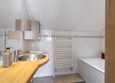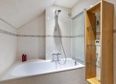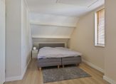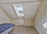 Via de woonkamer is er een trapopgang naar boven met daaronder een provisieruimte. De trap is in 2022 gerenoveerd, tegelijk met de vloerafwerking op de 1e verdieping. Via de overloop is er toegang tot 2 slaapkamers, een bergkast en de badkamer. De grootste slaapkamer is erg groot met 19 m² (en is voor de liefhebbers eventueel te splitsen in 2 kamers). Nu is het een royale slaapkamer met kleedruimte. De andere slaapkamer is ca. 7 m² groot en voorzien van een groot dakraam. Beide slaapkamers hebben laminaatvloeren. De nette badkamer heeft een ligbad voorzien van douchescherm, designradiator en wastafel met badmeubel. Via een vlizotrap is er ook nog een kleine bergzolder te bereiken boven de grote slaapkamer.