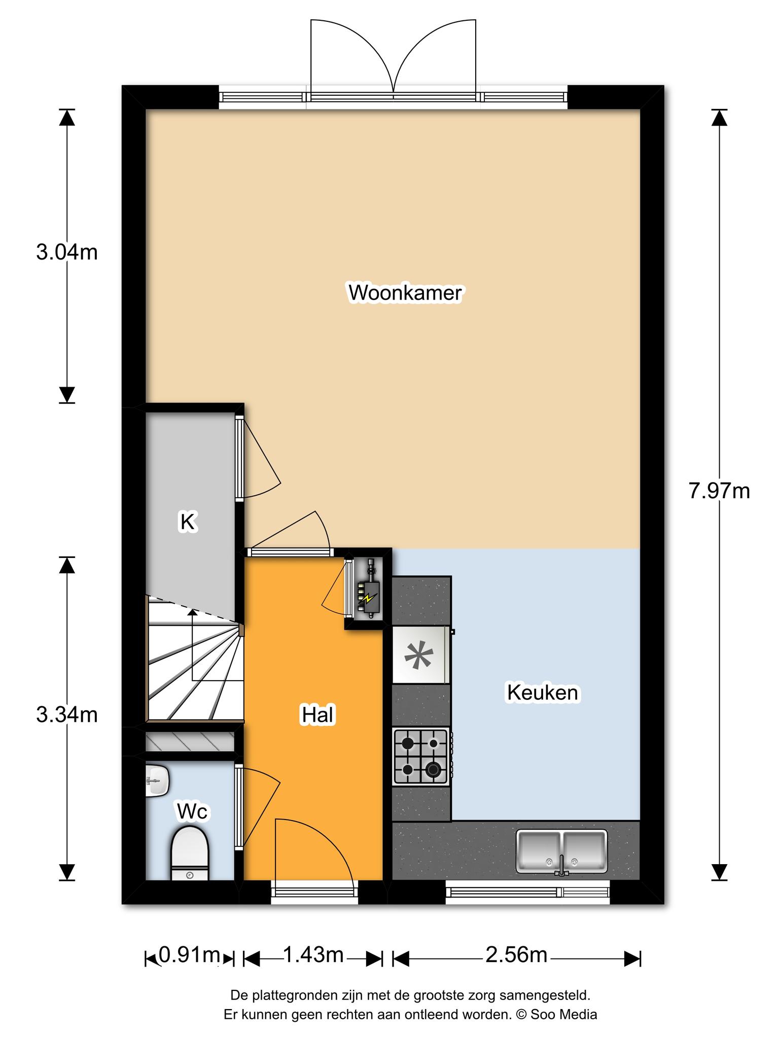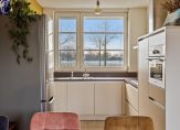 Hal met lichte laminaatvloer, meterkast, moderne toiletruimte voorzien van wandcloset en fontein, trapopgang naar eerste verdieping en toegang tot de woonkamer. De woonkamer is eveneens voorzien van dezelfde lichte laminaatvloer, spuitwerk op de wanden, een praktische trapkast en fijne openslaande deuren naar de tuin. Aan de voorzijde van de woning ligt de open keuken met moderne keukeninrichting voorzien van gaskookplaat, afzuigkap, combi oven/magnetron en vaatwasser (2023).