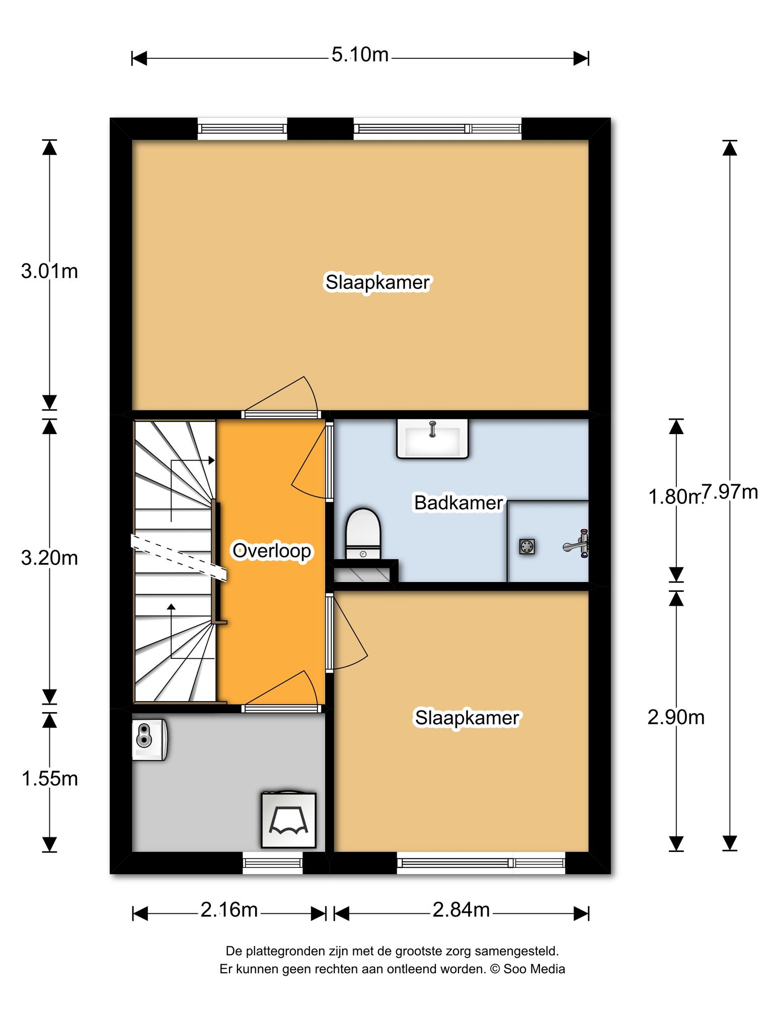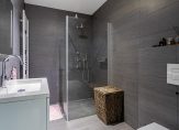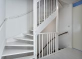 Overloop met mooie witte laminaatvloer en toegang tot twee slaapkamers, de badkamer, technische-/wasruimte en vaste trap naar de tweede verdieping. Beide slaapkamers zijn eveneens voorzien van een witte laminaatvloer en spuitwerk op de wanden. De keurige geheel betegelde badkamer is voorzien van een antraciet tegelvloer, inloopdouche met glazen wand, wandcloset, wastafelmeubel en designradiator. In de technische ruimte is de opstelling van de AWB combiketel (2008) en de WTW unit. Hier zijn ook de aansluitingen voor de wasmachine.
