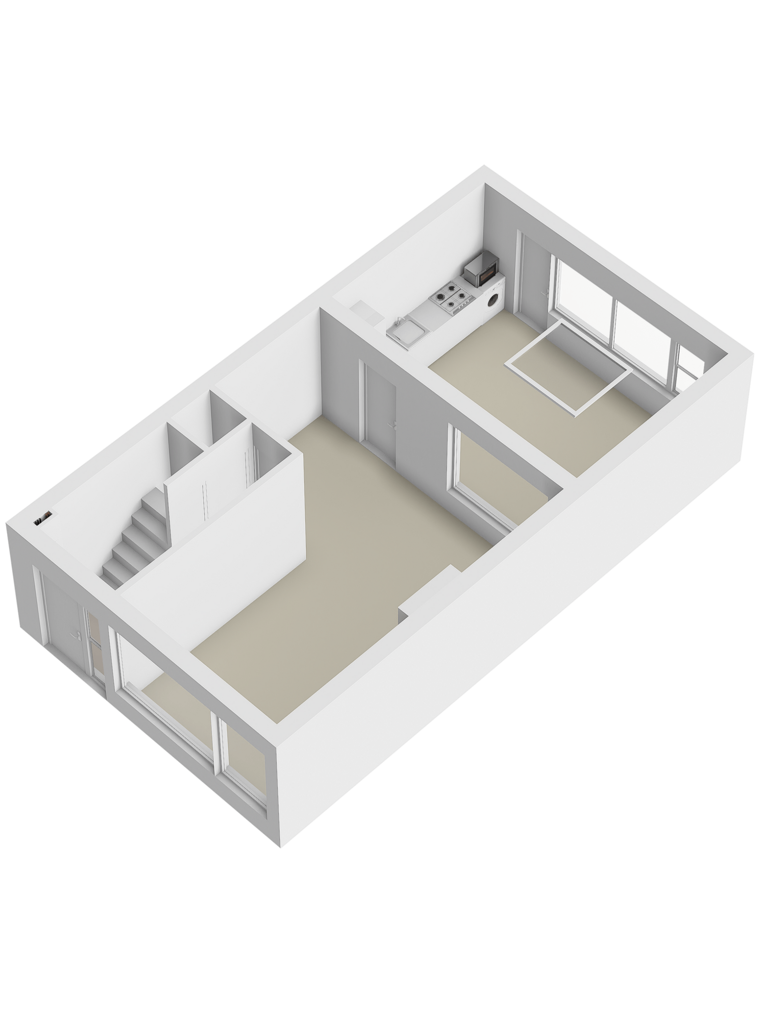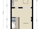 Hal met meterkast en trapkast. Ruime L-woonkamer met parketvloer en schouw voorzien van gaskachel. Aan de achterzijde is een grote woonkeuken aangebouwd met tegelvloer en rechte keukenopstelling voorzien van inbouwapparatuur zoals combi oven/magnetron, koelkast en gaskookplaat.