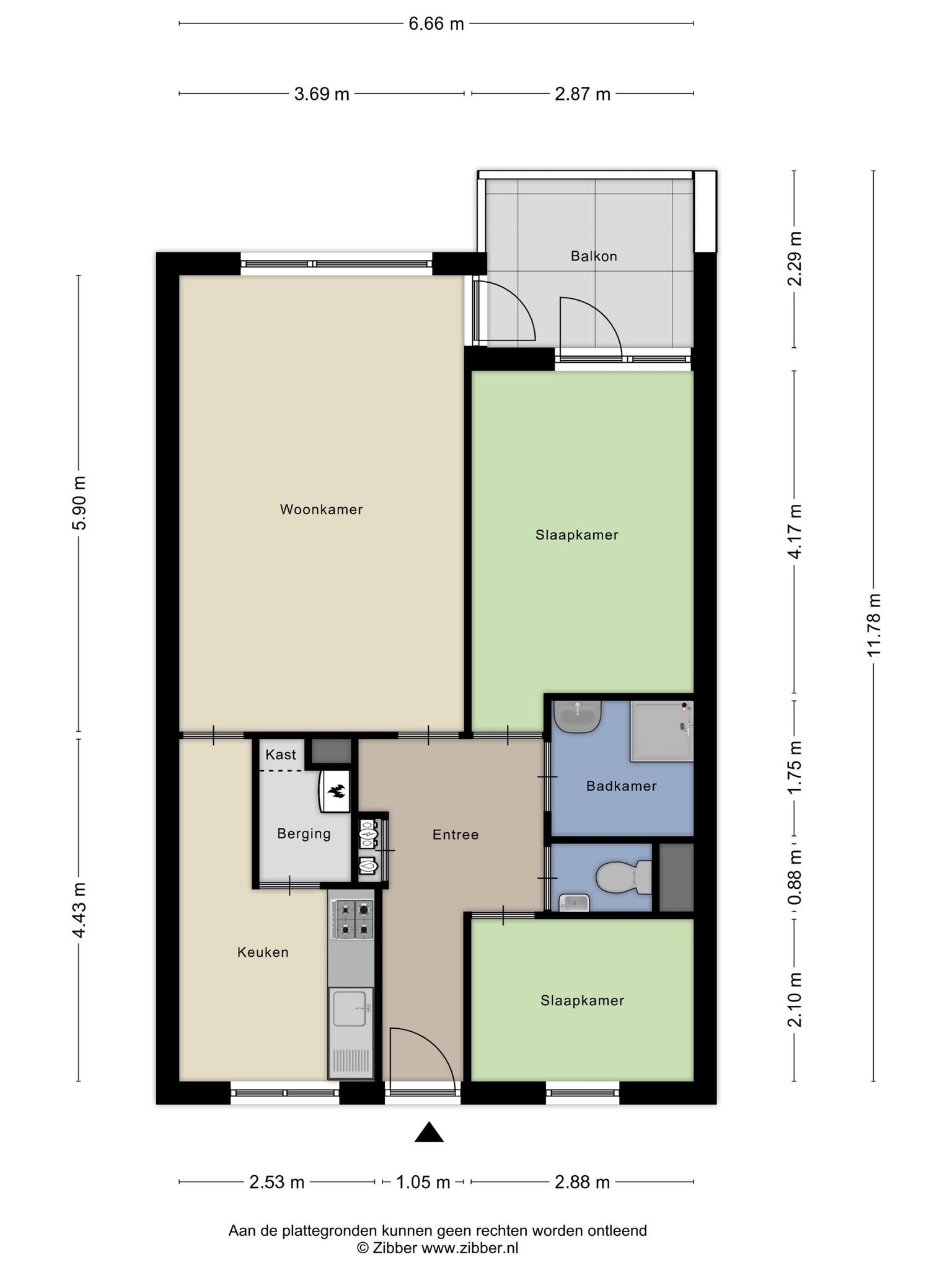 De woonoppervlakte bedraagt 65 m² exclusief balkon van ca. 6 m² en de berging is ca. 3 m² groot.