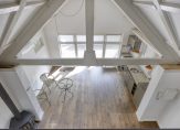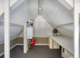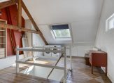De eerste verdieping beschikt over één ruime slaapkamer aan de voorzijde van de woning. Er ligt een houten vloer in de slaapkamer en er zijn twee grote ramen. De badkamer is ruim en praktisch ingedeeld, voorzien van een ligbad, wastafel met meubel en toilet. Ook hier is een groot raam dat zorgt voor prettig daglicht en een natuurlijke ventilatie. Zowel de slaapkamer als badkamer beschikt over een eigen vaste kast. Via een vaste trap bereik je de tweede verdieping. Hier is een royale open zolderruimte met karakteristieke houten balken en een dakraam voor lichtinval. De ruimte is nu in gebruik als wasruimte met opstelling voor de wasmachine en droger en beschikt daarnaast over praktische bergruimte. Eventueel is hier ook een slaap-/hobbykamer te maken.