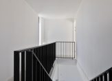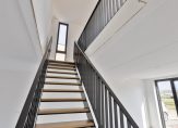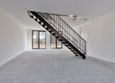 Hal met meterkast en luxe toiletruimte voorzien van wandcloset en fontein. Via de hal is ook toegang tot de inpandige berging en tevens technische ruimte. Hier staat de technische installatie en zijn aansluitingen voor het witgoed. De ruime woonkamer met open keuken is totaal circa 50 m² groot. In het midden van de leefruimte is een fraaie stalen trappartij met hardhouten treden naar de verdieping. Dit is een echte eyecatcher in de woning. Er zijn verder grote raampartijen met openslaande tuindeuren aan de achterzijde. De aansluitingen voor de keuken zitten aan de achterzijde van de woning.