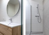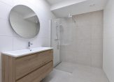 Vanuit het leefgedeelte is direct toegang tot een ruime slaapkamer met inloop-/kleedruimte van totaal circa 17.5 m². Door de aanwezigheid van een kleedruimte hoeft er in het slaapgedeelte ook geen kast geplaatst te worden. De slaapkamer heeft ook openslaande deuren naar de tuin. Bij de slaapkamer is direct ook de badkamer aanwezig, welke luxe is uitgevoerd met een grote inloopdouche, wandcloset en wastafel met meubel. Op de 1e verdieping is een royale overloop met toegang tot twee slaapkamers van beiden circa 10 m².