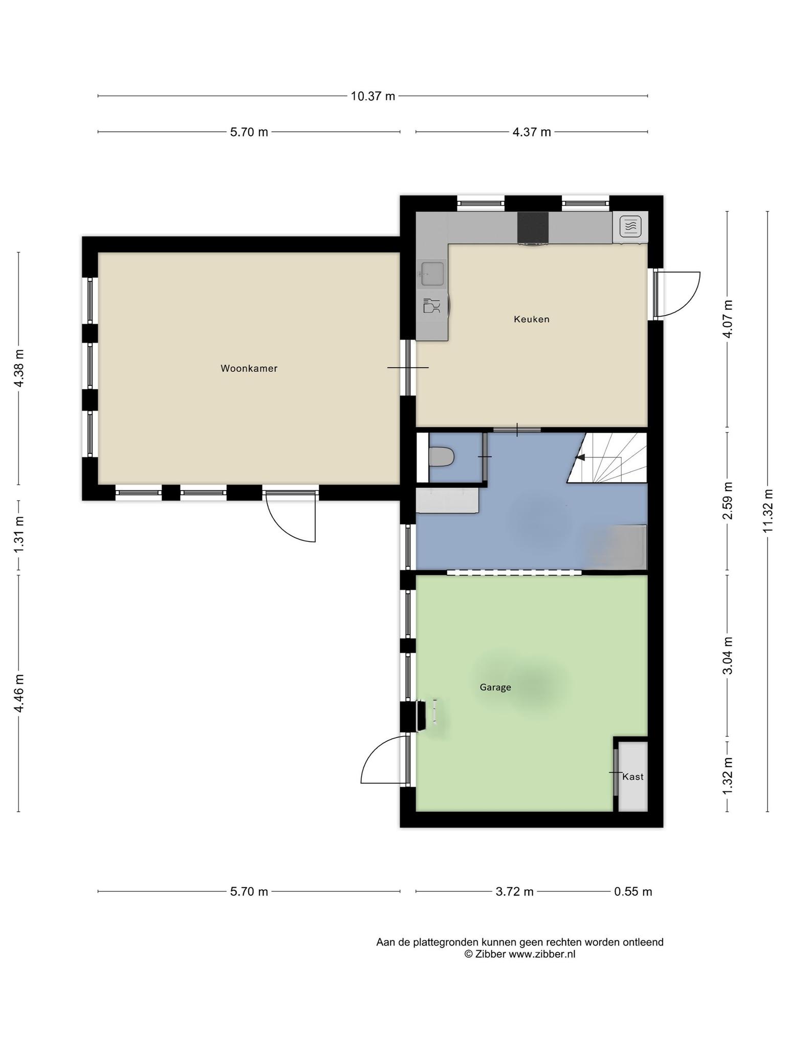 Het bijgebouw is op de begane grond ingericht met een woonkamer, woonkeuken met keukenopstelling voorzien van inbouwapparatuur en een inpandige berging/garage, welke eventueel ook in te richten is als slaapkamer. In deze ruimte is ook een toilet aanwezig. Verder is hier nog een vaste trap naar een grote bergzolder.