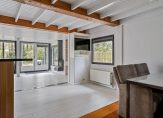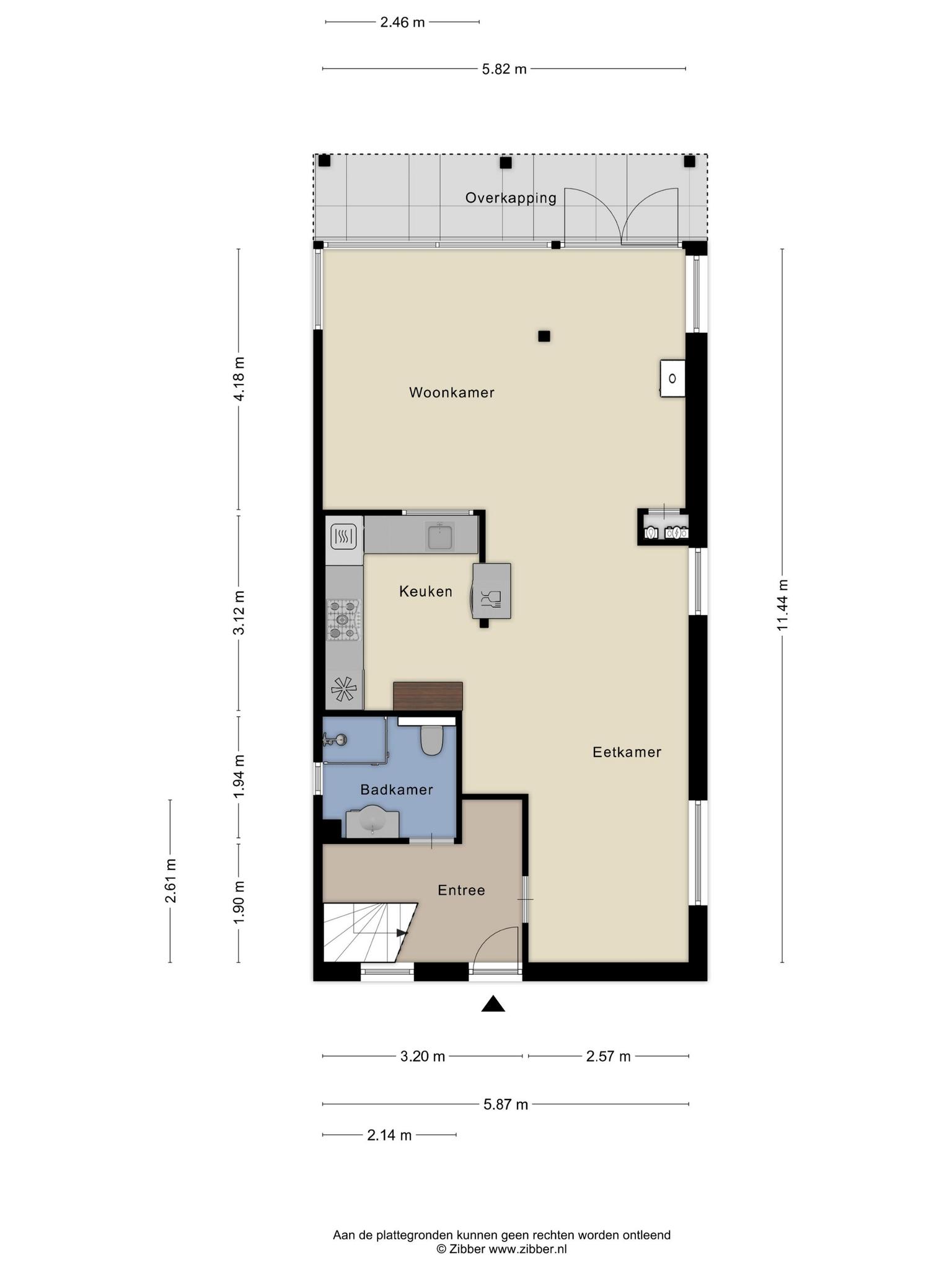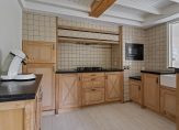 De voordeur zit aan de voorzijde van de woning. Daar is de hal met trapopgang naar de verdieping en de badkamer met wastafel, douchecabine en toilet. Bij binnenkomst in het leefgedeelte van de woning valt gelijk de gigantische ruimte op. Er is een eetgedeelte, open keuken en ruim zitgedeelte aan de tuinzijde, samen zo’n 57 m² groot. De open keuken beschikt over een houten inrichting met porseleinen gootsteen, gaskookplaat, oven/magnetron, koelkast, vaatwasser en een granieten aanrechtblad. Bij de woonkamer zijn rondom ramen en openslaande deuren naar de tuin. Hier hangt ook een gashaard. In een hoek van de woonkamer is ook de meterkast.