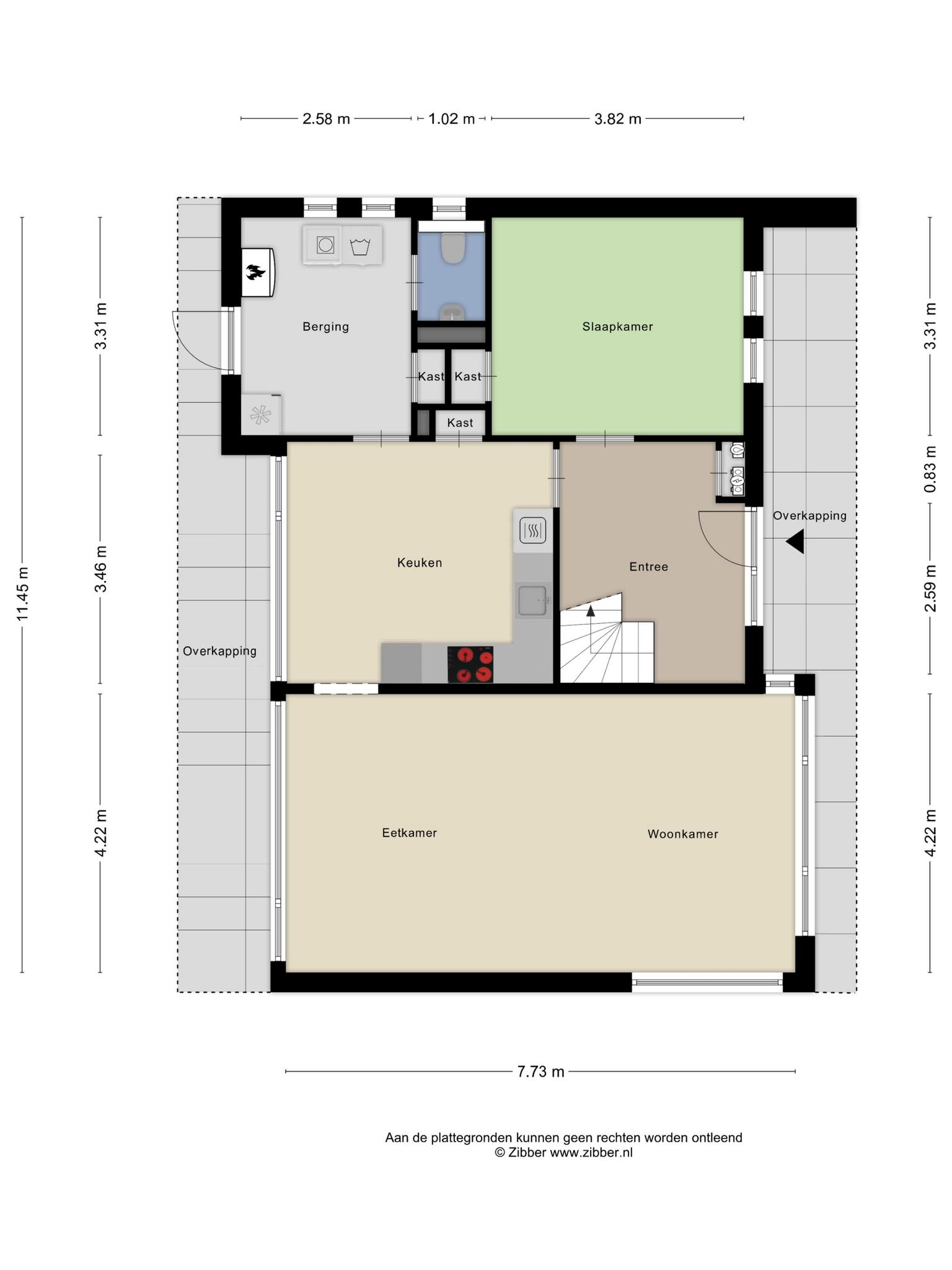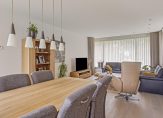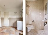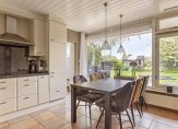 Hal met vide en meterkast. Vanuit de hal is toegang tot een slaapkamer op de begane grond. De ruime woonkamer heeft een eikenhouten vloer, spachtelputz wanden en een mogelijkheid voor het aansluiten van een kachel. Centraal in de woning ligt de woonkeuken met grote raampartijen gericht op de achtertuin. In de keuken staat een keurige inrichting voorzien van inbouwapparatuur zoals vaatwasser (op hoogte), koelkast, combi oven/magnetron en keramische kookplaat. Op de vloer in de keuken liggen tegels en er is een praktische vast kast, ideaal als voorraadkast. Aansluitend is er nog een bijkeuken met aansluitingen voor het witgoed, een uitstortgootsteen en de Neft HR combiketel. In de bijkeuken is ook een nette toiletruimte en de buitendeur naar de tuin met terras.