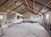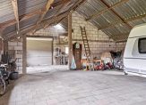 Rechts van de woning ligt een grote oprit en riante vrijstaande schuur. Deze schuur is in 1972 gebouwd en aan de voorzijde voorzien van een grote roldeur. De schuur is oud en voorzien van asbestgolfplaten dak, maar het is een hele mooie grote ruimte die geschikt is voor verschillende doeleinden. Een mooie klus-/hobbyruimte, maar ook voor opslag/stalling van bijv. klein materiaal en een auto/bus voor ZZP-ers.