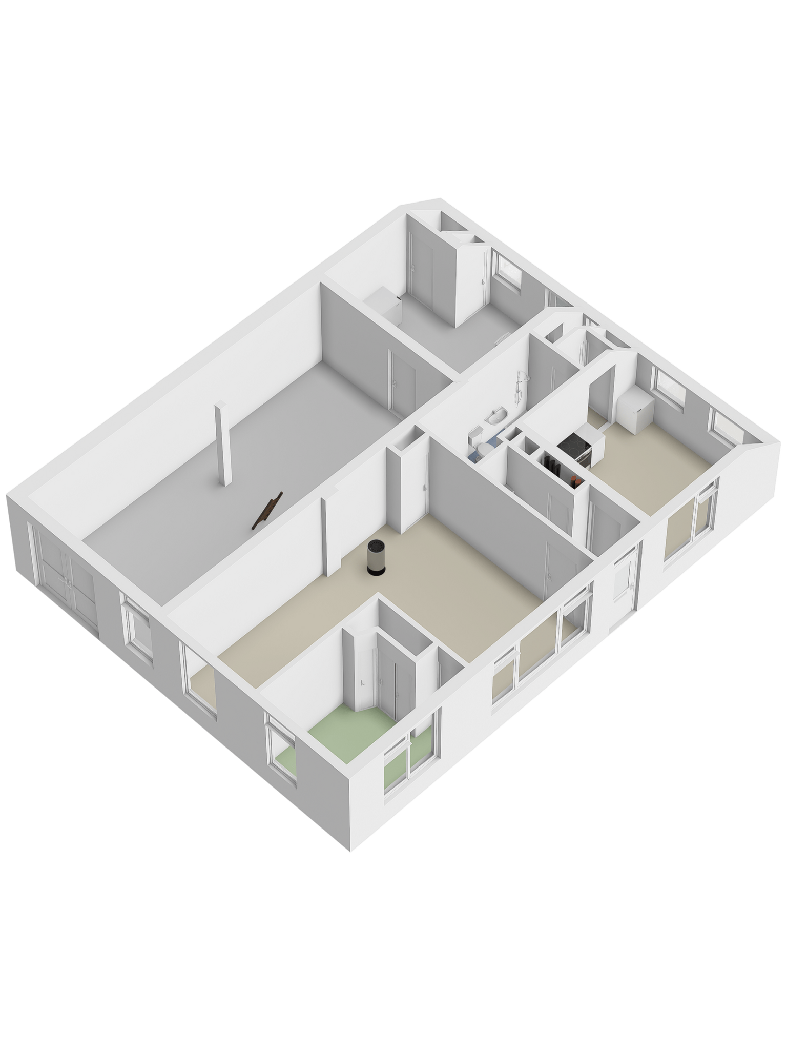 Hal met meterkast en trapopgang naar de verdieping. Vanuit de hal is toegang tot de woonkamer en woonkeuken. De woonkamer is voorzien van een houten vloer, balkenplafond en schouw met houtkachel. Vanuit de woonkamer is toegang tot een slaapkamer op de begane grond. De woonkeuken biedt voldoende ruimte voor een eettafel. Verder is hier een houten keukeninrichting met elektrische kookplaat, afzuigkap, spoelbak en vaatwasser. Bij de keuken is een praktische vaste kast. Vanuit de keuken is toegang tot een grote bijkeuken/berging en de badkamer.