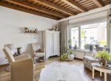 Hal met nette toiletruimte en meterkast. Bij binnenkomst in de woonkamer valt gelijk de enorme leefruimte op, waarbij een speelse indeling is ontstaan door de uitbouw aan de achterzijde. Aan de voorzijde van de woning is een zithoek, maar ook aan de tuinzijde is een iets verlaagd zitgedeelte. Er ligt een massief houten vloer in de leefruimte. In het midden van de woning is de open keuken met lichte inrichting voorzien van combi oven/magnetron, vaatwasser, koelkast, inductiekookplaat en geheel afgewerkt met een granietenblad en aansluitend eettafel.