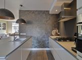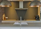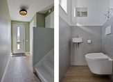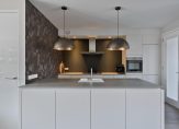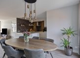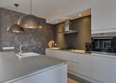 Hal met trapkast, meterkast en keurige toiletruimte met wandcloset en fontein. Op de vloer in de hal ligt een tegelvloer in hout motief, welke doorloopt over de gehele benedenverdieping. Uiteraard is de vloer voorzien van vloerverwarming. Het stucwerk is geheel strak uitgevoerd bij wanden en plafond. Bij binnenkomst in de woonkamer valt direct de grootte van de leefruimte op. Een heerlijke lichte ruimte die voldoende plaats biedt voor een grote eettafel en zithoek. Aan de achterzijde zijn openslaande tuindeuren aanwezig. De keuken staat in open verbinding met de woonkamer en is voorzien van een luxe en moderne inrichting, welke compleet is uitgevoerd met vaatwasser, oven, koelkast, gaskookplaat, spoeleiland en geheel afgewerkt met een composiet blad. Aansluitend bij de keuken is een praktische bijkeuken/berging met vaste schuifkastenwand en buitendeur naar de tuin.