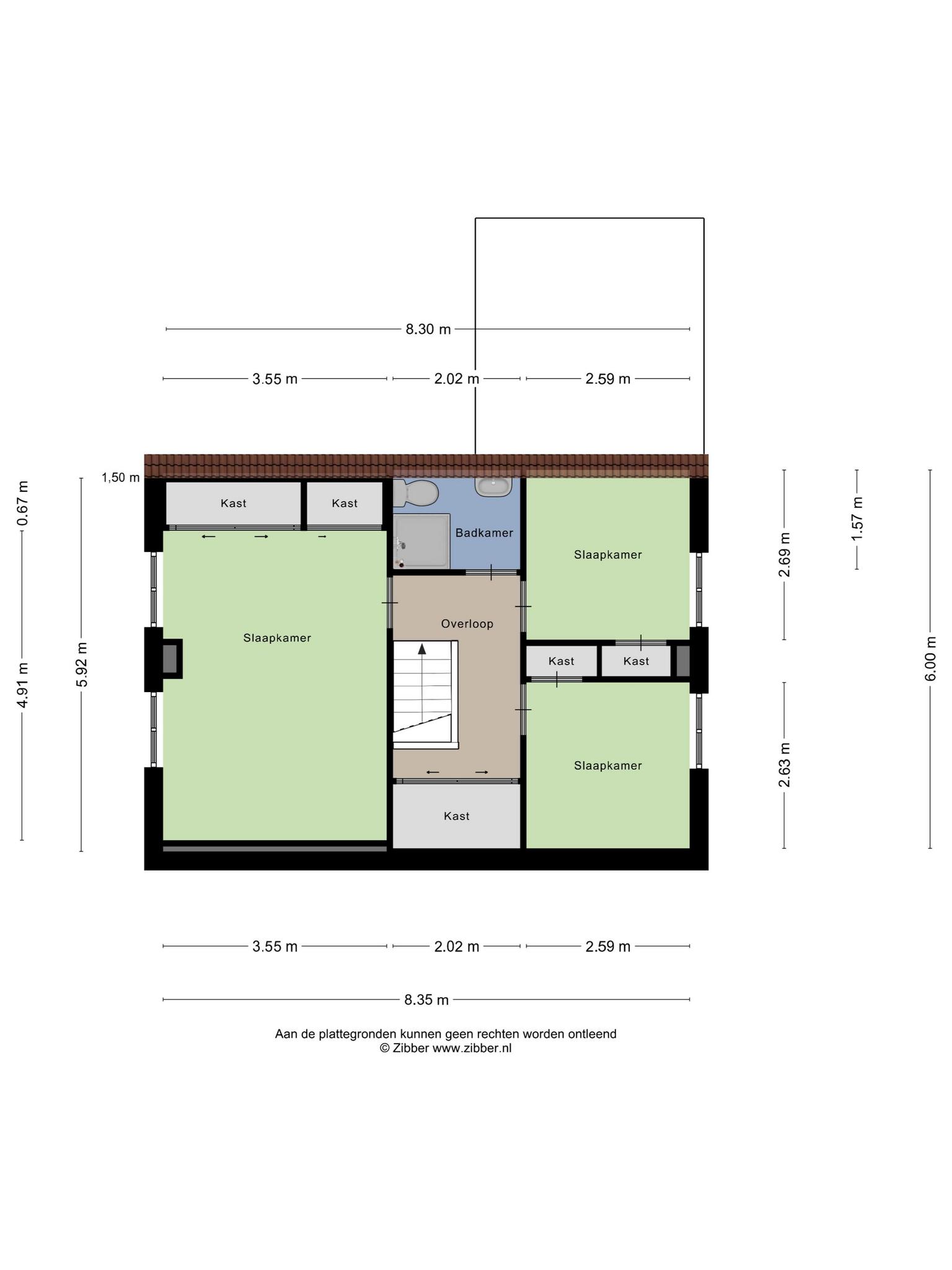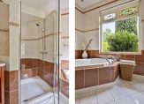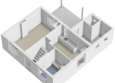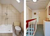 1e Verdieping: Via de overloop zijn 3 slaapkamers en een kleine 2e badkamer bereikbaar. Verder is er volop bergruimte onder de schuine kanten van het dak. De slaapkamers zijn respectievelijk ca. 17.4 – 7.3 en 7.4 m² groot. De eenvoudige badkamer is voorzien van douche, wastafel en toilet.