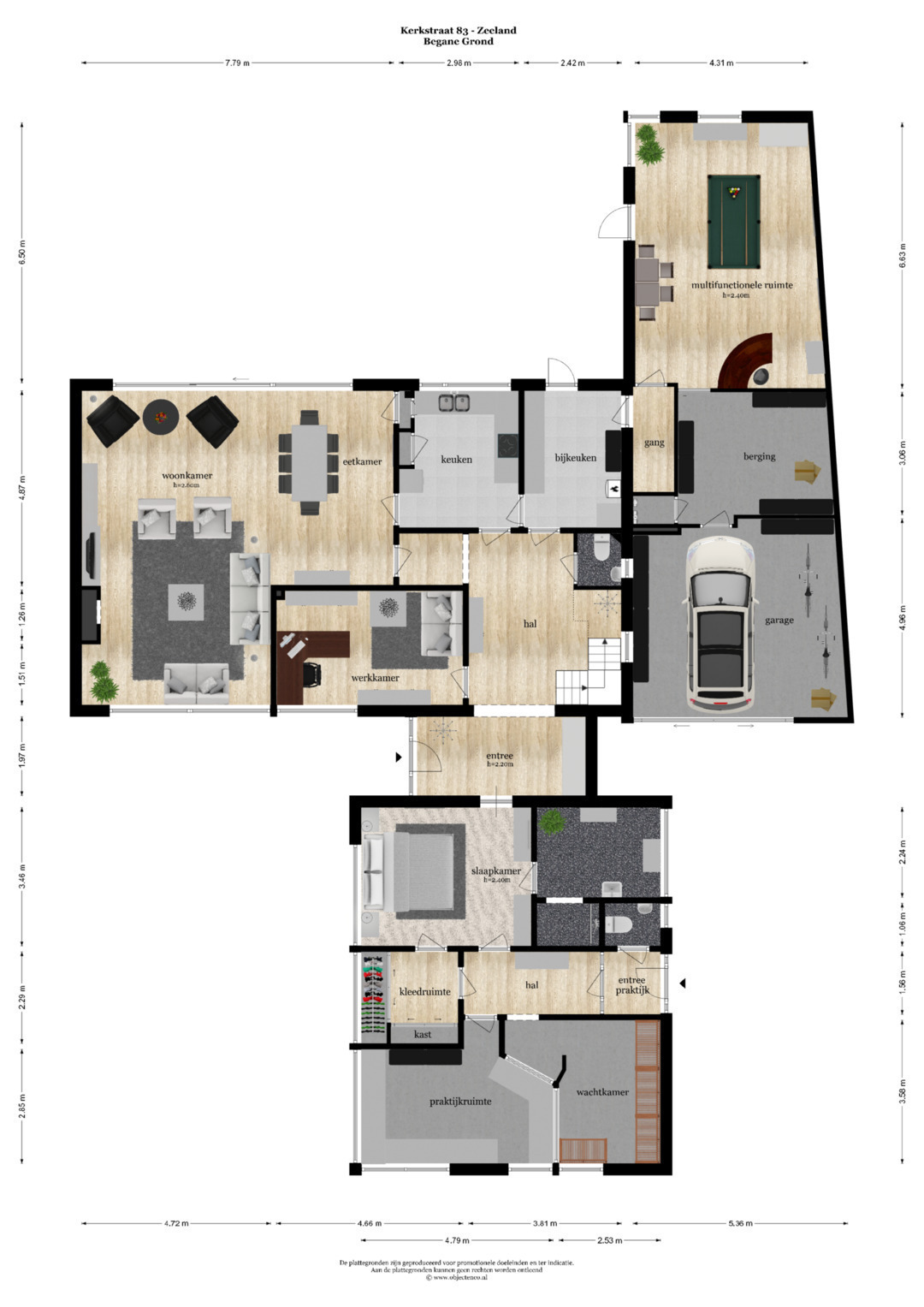 Het eerste deel van het object bestaat uit de voormalige praktijkruimte welke via een aparte entree aan de rechterzijde van het perceel toegankelijk is. Een deel van deze praktijk is nog in tact, u treft hier een gang met toiletruimte, wachtruimte en praktijkruimte. Een ander deel is bij de woning betrokken en ingericht met slaapkamer, kleedkamer en badkamer op de begane grond.