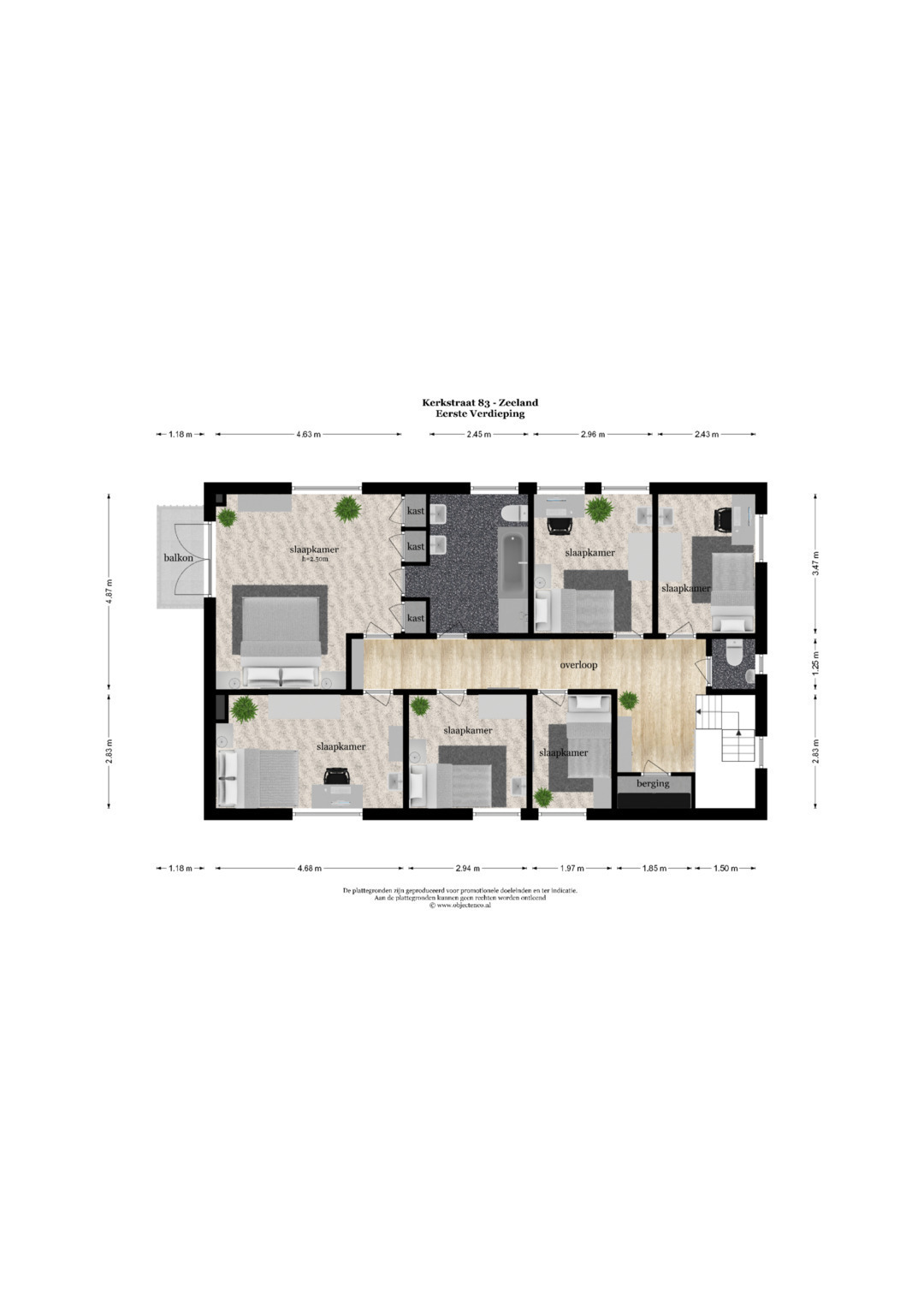 Via de overloop is er toegang tot maar liefst 6 slaapkamers, een aparte toiletruimte en de badkamer. De ouderslaapkamer heeft de beschikking over een eigen balkon op zonzijde.