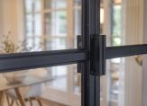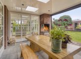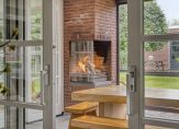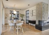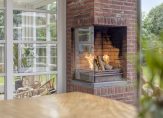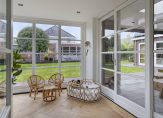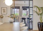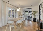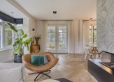 Entree met meterkast, trapopgang met daaronder een kelderkast voorzien van waterontharder. Vervolgens komt u in de woonkamer met aangebouwde serre van ca. 46 m². Vanuit de woonkamer en serre heeft u rondom een mooi uitzicht op de tuin en veel lichtinval. Er zijn meerdere schuifpuien voor toegang naar de veranda. De veranda is voorzien van drie lichtkoepels, een zonnescreen en een buitenhaard, zodat u hier tot in de late uurtjes buiten kunt blijven. De woonkamer is strak en modern afgewerkt met een visgraat houten vloer, gestucte wanden en plafonds met inbouwspots en als blikvanger een sfeervolle gashaard van Boley. De moderne stalen taatsdeuren vormen de afscheiding tussen woonkamer en woonkeuken.