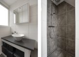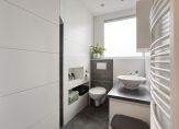 De moderne badkamer biedt extra ruimte door de aanwezigheid van de toegevoegde dakkapel en biedt ruimte aan een inloopdouche, een wandcloset, wastafel met badmeubel en een designradiator. De wanden zijn geheel betegeld en het leidingwerk is vernieuwd.